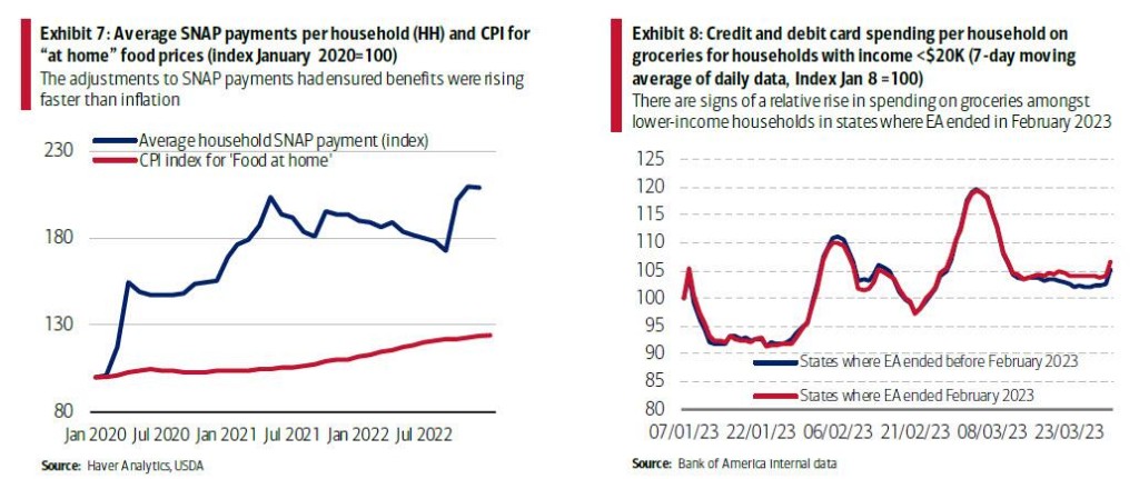 截至 3 月 31 日的最新美国银行卡数据表明,低收入家庭,特别是年收入低于 2 万美元的家庭,可能已经转向使用个人信用卡和借记卡购买食品。其中一个原因可能是美国大部分州在 2 月底结束了 SNAP(食品券计划)的福利政策。