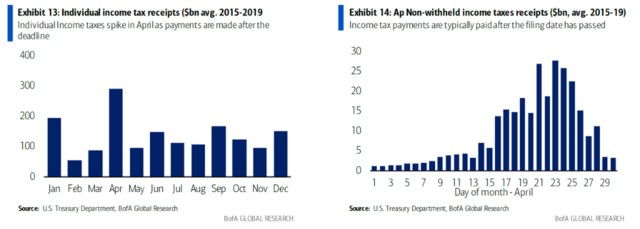 本月月末的纳税数据将让我们更加确定这一点,截至 4 月 14 日的税收约占非预扣申报季税收总额的 15%—17%。从下图可以看出,4 月中旬的税纳税额减少,未能创造额外的喘息之机。