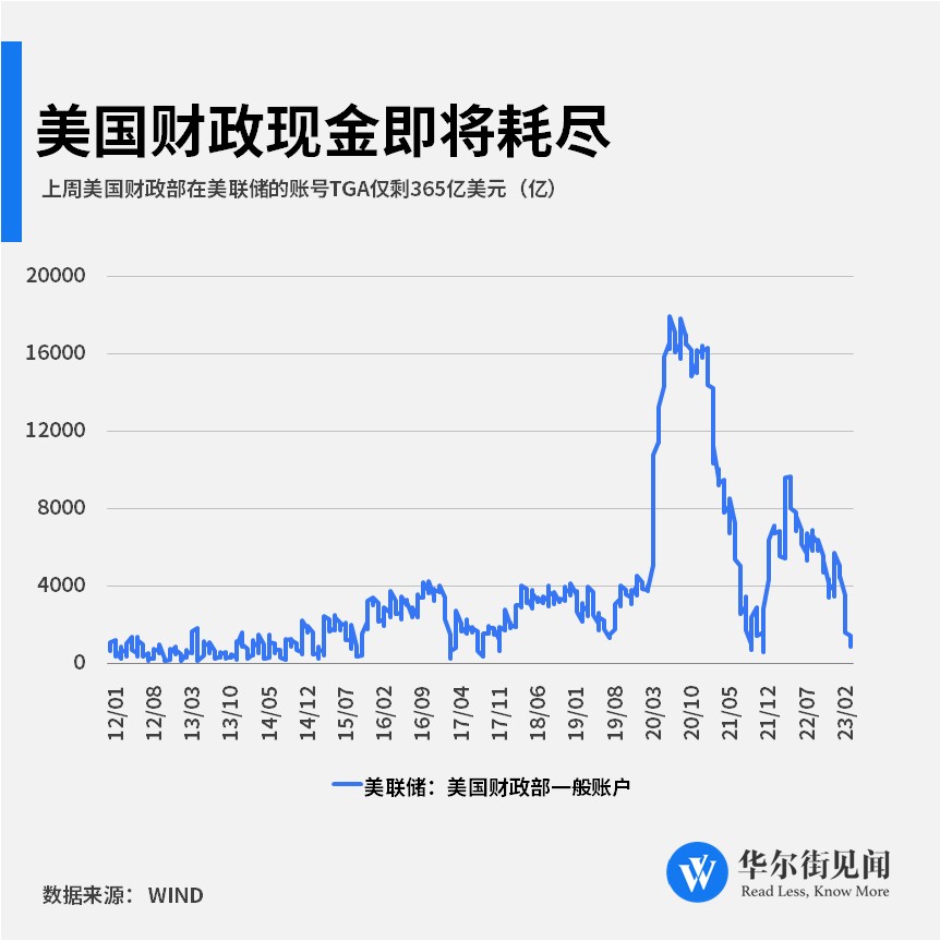 与此同时,随着债务大限越来越近,美国政府即将耗尽储备现金。为避免突破债务上限,美国财政部在美联储的储备现金账户(TGA)过去一个月出现持续下跌,已经从去年的高位 1 万亿,降至 15 月来最低点 365 亿,接近耗尽。