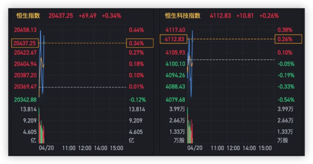 4 月 20 日周四,港股小幅低开后转涨,截至发稿,恒指涨 0.34%,恒生科技指数涨 0.26%。