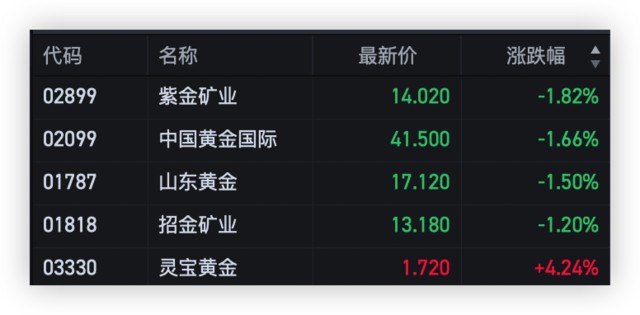 紫金矿业、中国黄金等多股跌超 1%,灵宝黄金逆市涨 4%。