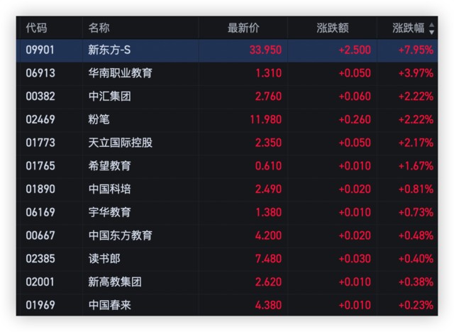 新东方涨近 8%,中南职业教育、中汇集团等跟涨,直播电商东方甄选跌超 5%。