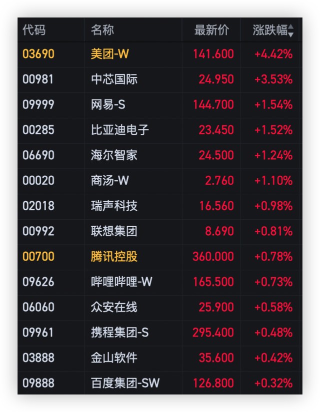 美团涨 4%,网易、商汤涨超 1%,腾讯、携程、阿里、京东等跟涨,短视频巨头快手恐遭腾讯减持,继上个交易日跌 4% 后,今晨再度深跌 5%。