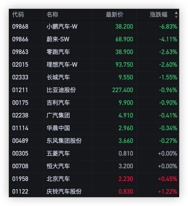小鹏跌近 7%,蔚来跌超 4%,零跑、理想跌超 2%。
