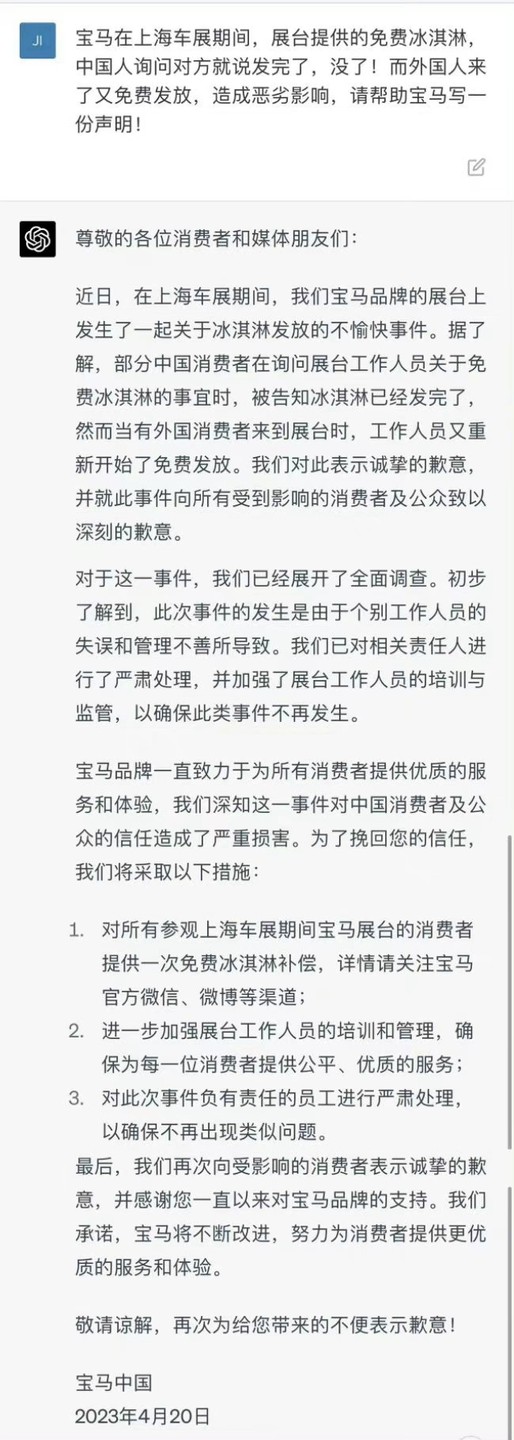 有网友甚至搬出了 ChatGPT 帮宝马撰写公关稿: