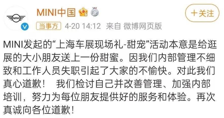 其官方微博 MINI 中国回应称:“MINI 发起的 ‘上海车展现场礼 - 甜宠’ 活动本意是给逛展的大小朋友送上一份甜蜜。因我们内部管理不细致和工作人员失职引起了大家的不愉快。对此我们真心道歉!我们检讨自己并改善管理、加强内部培训,努力为每位朋友提供好的服务和体验。再次真诚向各位道歉!”