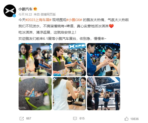 小鹏汽车当天下午在官方微博发文欢迎 “鹏友们” 到展台领冰淇凌,“真心实意地派冰淇淋”: