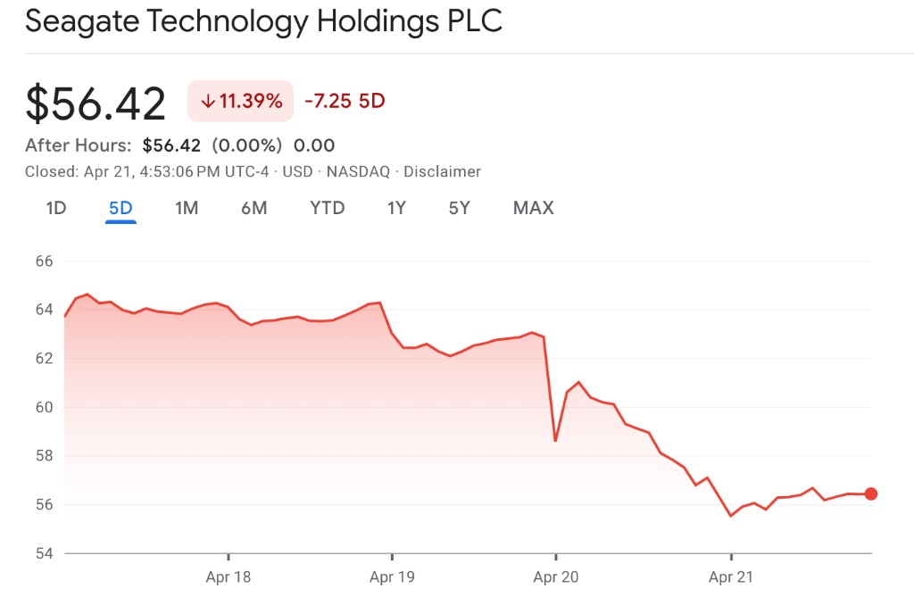 财报发布后,希捷股价大跌 9.2%,本周希捷已累计跌超 11%,创半年最大跌幅。