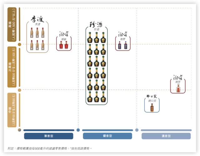 从产品上看,珍酒李渡旗下主要包括旗舰品牌珍酒、品牌李渡,以及两个地区品牌湘窖及开口笑在内的四大白酒品牌,覆盖酱香型、浓香型、兼香型三大白品类。