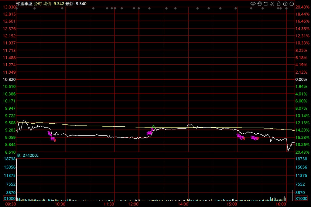 4 月 27 日,港股白酒第一股珍酒李渡正式挂牌上市,9 港元开盘破发,较发行价跌 16.8%,一手浮亏 360 多港元。截止收盘,珍酒李渡跌近 18%,报 8.88 港元,总市值为 290.5 亿港元。