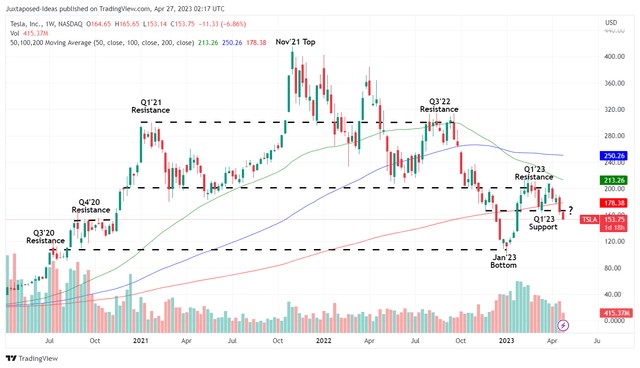 目前,特斯拉已经突破了 23 年第一季度 170 美元的支撑位,已经重新测试了 20 年第四季度的 150 美元水平,如果不是 2023 年 1 月的 110 美元水平的话。