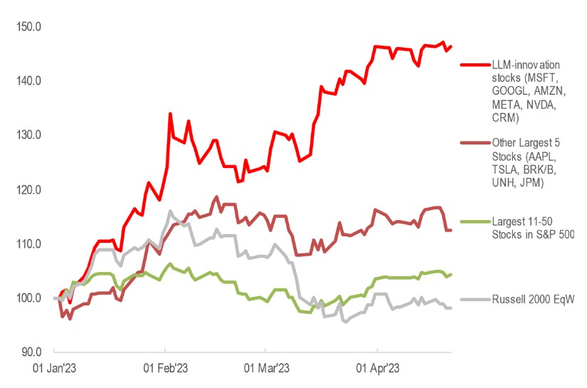 这一分析将微软、Alphabet、亚马逊、Meta、英伟达和 Salesforce.com 等 “大型语言模型 - 创新” 股(LLM-innovation stocks)纳入其中。摩根大通指出,这些股票的表现优于其他五只大型股(苹果、特斯拉、伯克希尔哈撒韦、联合健康集团和摩根大通),以及标普 500 指数中排名 11-50 的成分股和罗素 2000 指数。