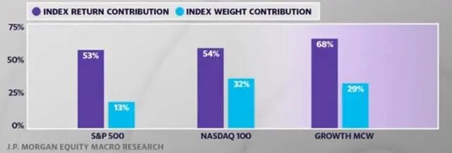 摩根大通近期的一项分析也显示,由 ChatGPT 和其他大型语言模型引发人工智能热潮,贡献了今年以来标普 500 指数 53% 的涨幅和纳斯达克 100 指数 54% 的涨幅。对生成式 AI 的炒作创造了 1.4 万亿美元的股票市值,年初至今增长了 45%。