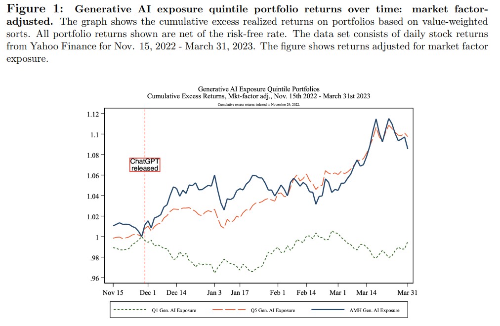 研究人员发现,在 ChatGPT 发布后的几周内,对生成式 AI 敞口较高的公司每天的超额回报比敞口较低的公司高出 0.4%。这意味着年化回报率超过了 100%。