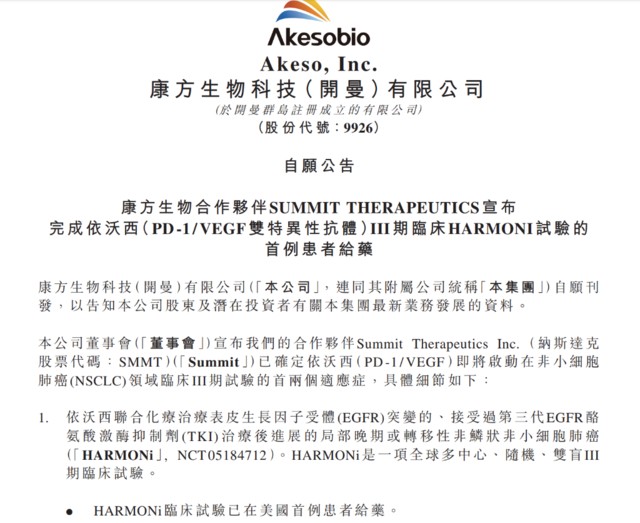在 2022 年 12 月 6 日,康方生物与 Summit Therapeutics 达成了合作协议,将康方生物的 PD-1/VEGF 双抗 AK112 的权益在美国、加拿大、欧洲和日本交给了 Summit Therapeutics。Summit Therapeutics 支付了 5 亿美元的预付款,并最多支付总计 50 亿美元的交易金额,其中包括开发、注册和商业化的里程碑费用。