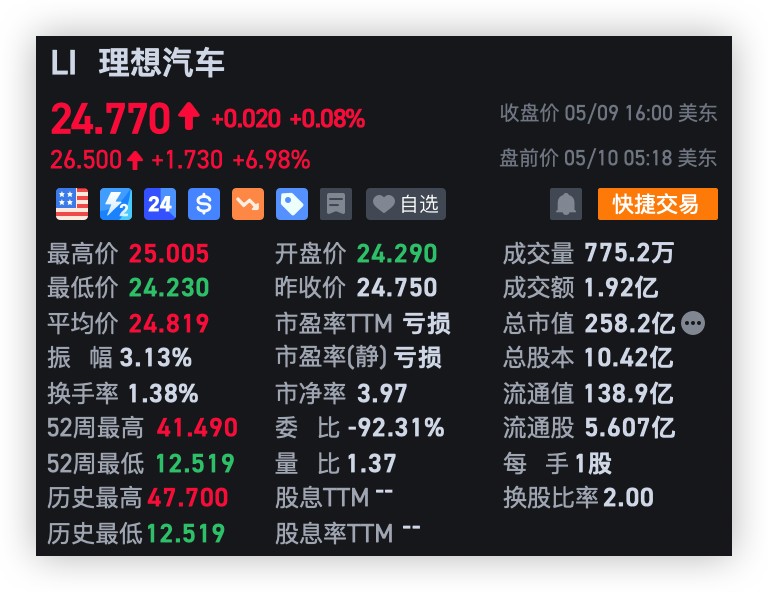 财报发布后,理想美股盘前大涨,截至发稿,理想涨近 7%。
