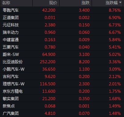 零跑汽车涨 8.76%,五菱汽车、蔚来涨超 5%,比亚迪、小鹏、涨超 3%,吉利、理想、广汽等跟涨。
