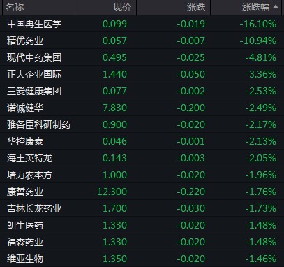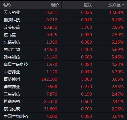 天大药业涨超 12%,艾美疫苗、位元堂涨超 7%,药明生物涨 5.69%,百济神州涨 3.65%,再鼎医药、康龙化成涨超 2%,中国再生医学跌超 16%,精优药业跌超 10%。