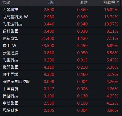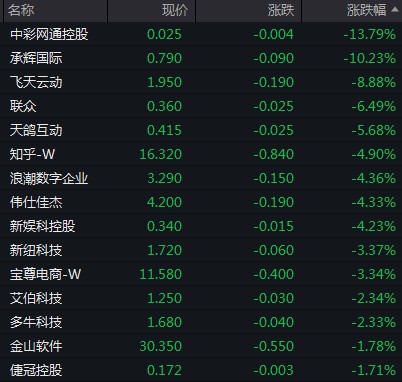 力盟科技、联易融科技、飞思达科技涨超 10%,数科集团涨超 8%,知乎跌 4.9%,金山软件跌 1.78%,微博跌 0.9%。