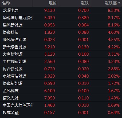 龙源电力、华能国际电力、瑞风新能源涨超 8%,协鑫科技、顺风清洁能源、新天绿色能源涨超 4%,大唐新能源、中广核新能源等涨幅居前。