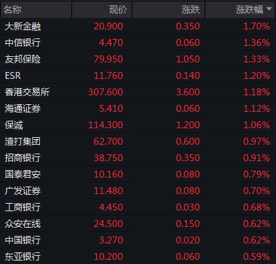 大新金融、中信银行、港交所、海通证券等涨超 1%,招商银行、国泰君安等跟涨。