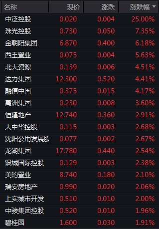 中泛控股 25.00% 领涨内房股,珠光控股涨超 7%,融信中国、龙湖集团、银城国际等涨幅居前。