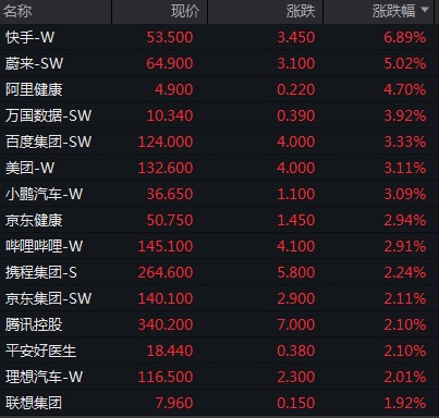 快手盘中涨幅一度扩大至 8%,收涨 6.89%,蔚来涨 5.02%,阿里健康涨 4.07%,万国数据、百度、美团、小鹏汽车涨超 3%。