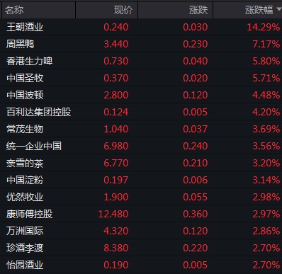 王朝酒业涨超 12%,周黑鸭涨超 7%,珍酒李渡、怡园酒业收涨 2.7%。