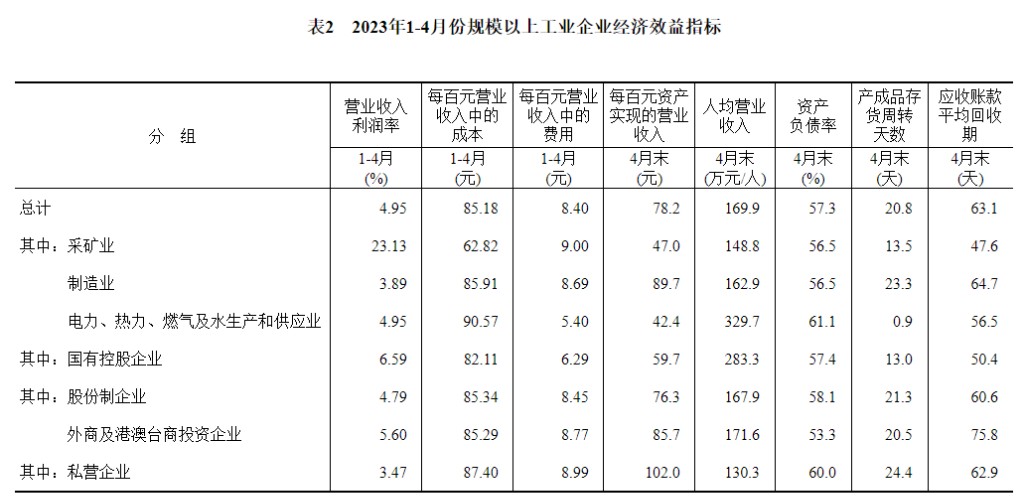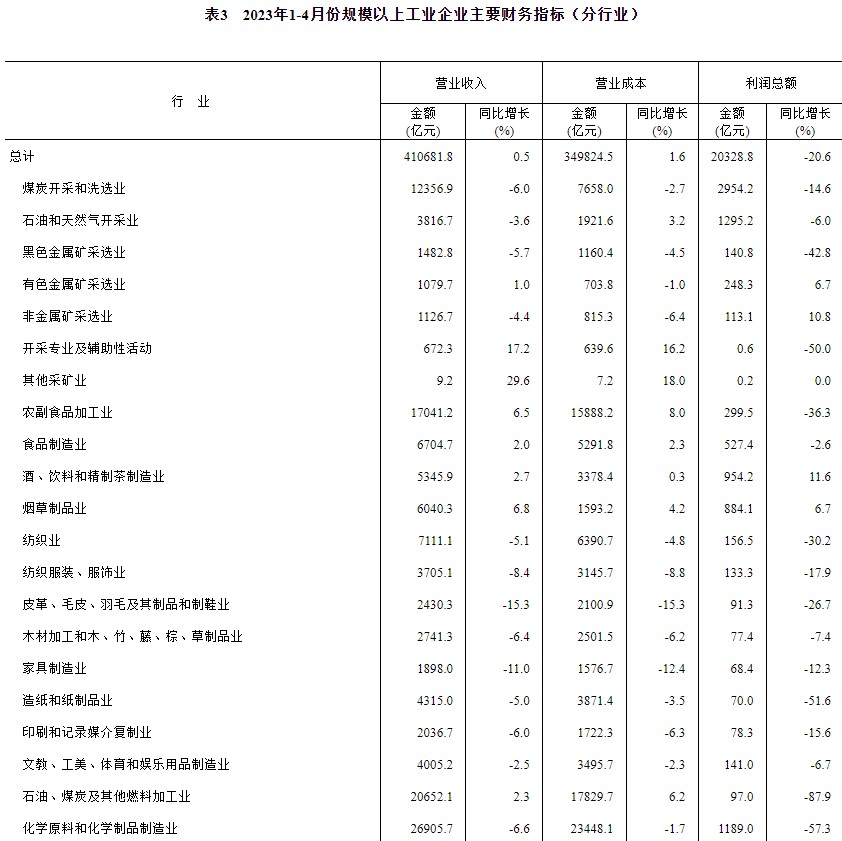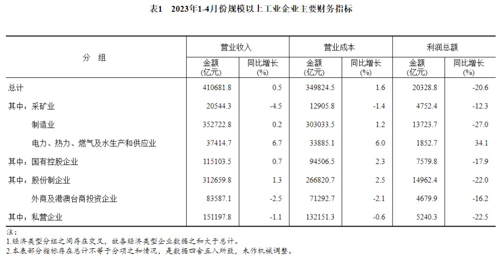 国家统计局:2023 年 1-4 月份全国规模以上工业企业利润下降 20.6%