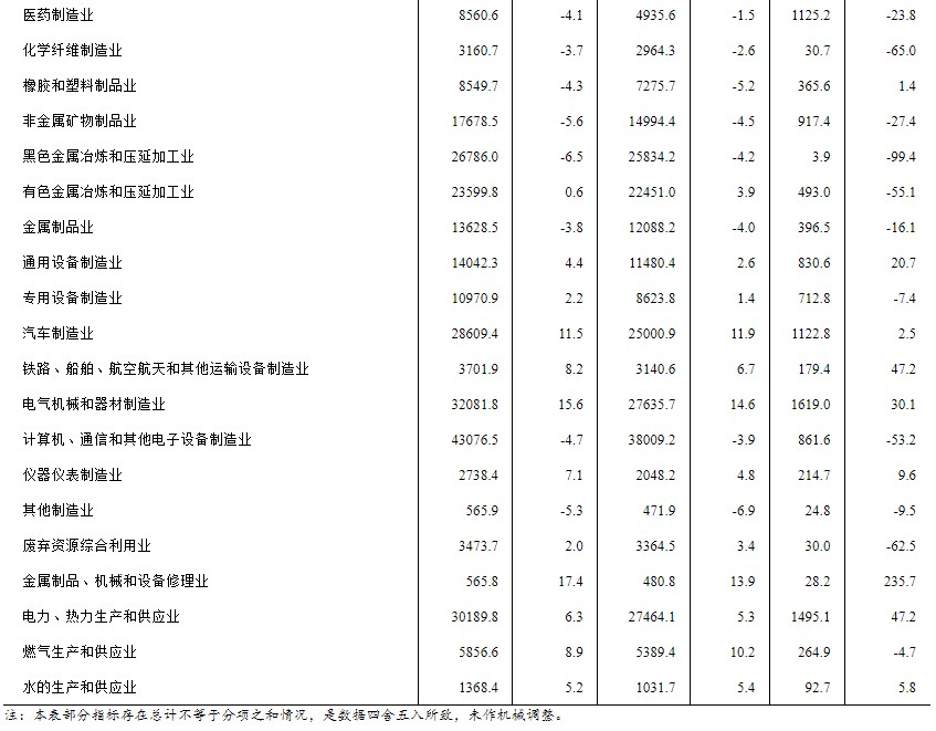 电力、热力生产和供应业利润总额同比增长 47.2%,电气机械和器材制造业增长 30.1%,通用设备制造业增长 20.7%,汽车制造业增长 2.5%,石油和天然气开采业下降 6.0%,专用设备制造业下降 7.4%,煤炭开采和洗选业下降 14.6%,非金属矿物制品业下降 27.4%,纺织业下降 30.2%,农副食品加工业下降 36.3%,计算机、通信和其他电子设备制造业下降 53.2%,有色金属冶炼和压延加工业下降 55.1%,化学原料和化学制品制造业下降 57.3%,石油、煤炭及其他燃料加工业下降 87.9%,黑色金属冶炼和压延加工业下降 99.4%。
