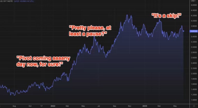 当然,卖家对这个新词感到困惑,市场预期数据显示,6 月加息概率从一周前的 69% 高点降至 23%。美债也在狂欢,10 年期收益率跌至 3.6%。