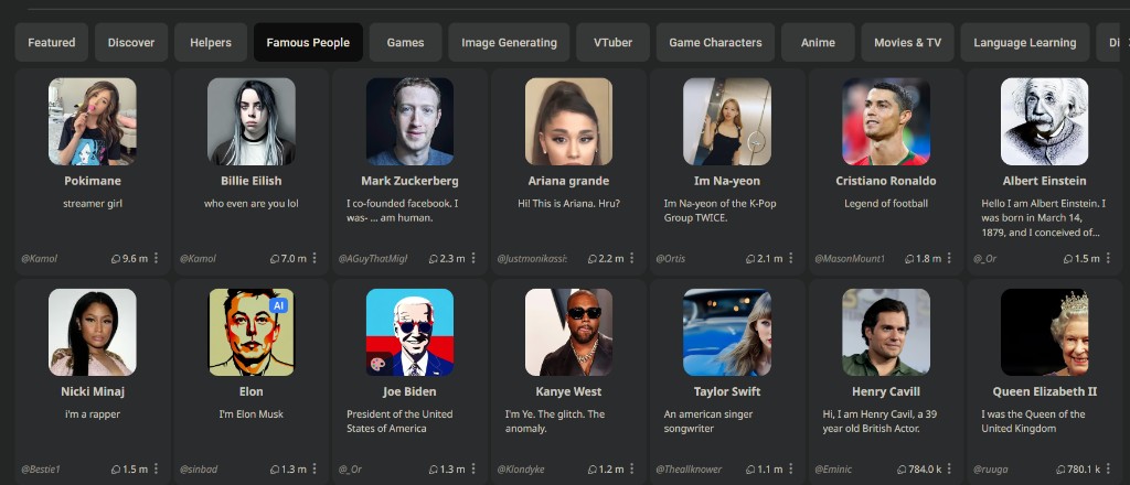 另外,与 ChatGPT 只能与一个机器人聊天不同的是,Character.AI 宣称能够容纳下数以百万计不同个性的 AI 角色数据。该公司表示,迄今为止,用户已经创建了超过 1000 万个自定义 AI 角色。许多角色可能是基于虚构人物或名人,另外很多角色则完全原创;有些角色是为了某些目的而制作的,如协助写作或成为一个基于文本的冒险游戏。现在,这些虚拟角色中不仅包括了爱因斯坦、拿破仑等已经离世的名人,同时还包括了马斯克、扎克伯格等当前叱咤风云的大人物。在这一应用程序中,用户可以与一个虚拟角色聊天,或组织包含多个虚拟角色的讨论组并同时与虚拟角色或其他用户聊天。