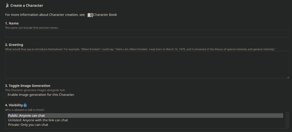 单击 Character.AI 主页上的 “创建” 按钮,然后选择 “创建角色”。用户将输入要创建的角色的名称,以及他们在每次新聊天开始时发送的简短问候语,然后继续进行了一段较长的自我介绍,通常用户会选择这位角色的个性特征等等。