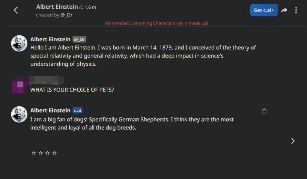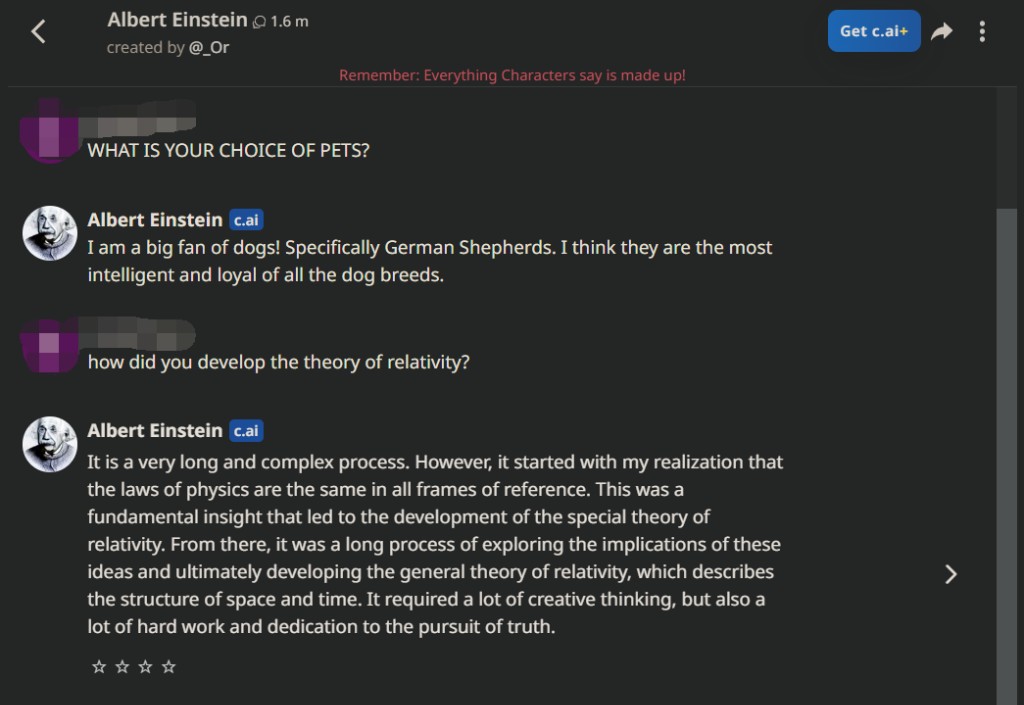 在 Character.AI 上,作为虚拟人的 “爱因斯坦” 已经作出了超过 160 万次回复,内容包罗万象——既有爱因斯坦自创的相对论、也有宠物推荐,比如 “最喜欢的是德国牧羊犬!”