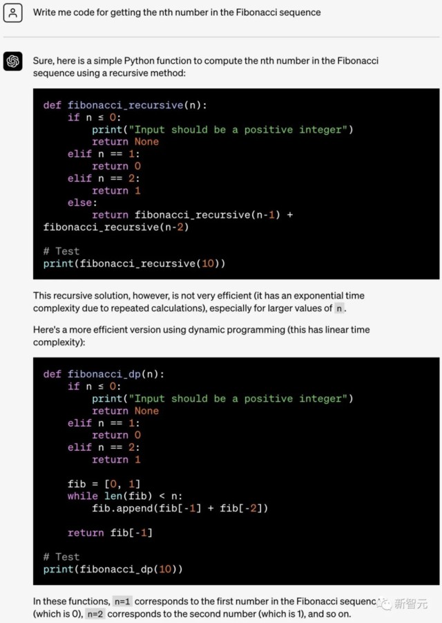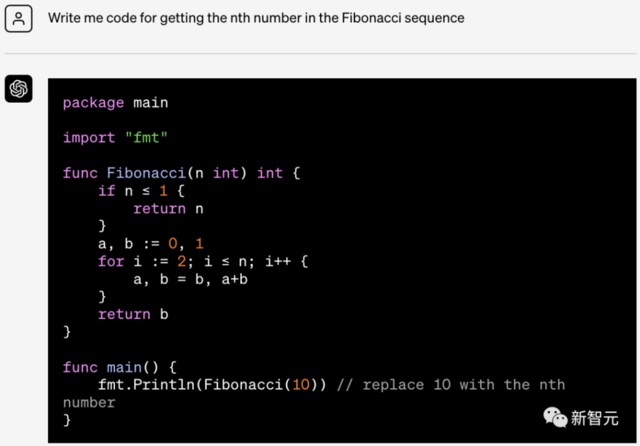 在了解到用户的需求之后,ChatGPT 直接给出了一段用 Golang 编写的「斐波那契数列中第 n 个数字」的代码。