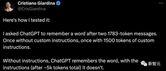 还有人发现,输入「自定义指令」后,ChatGPT 变笨了。我要求 ChatGPT 在两条有 1783 个 token 的信息后记住一个单词。一次没有自定义指令,一次有 1500 个 token 的自定义指令。在没有指令的情况下,ChatGPT 记住了这个单词,而在有指令的情况下(总共约 5000 个 token),ChatGPT 却没有记住这个单词。