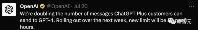 就在昨天,OpenAI 宣布下周向所有 Plus 用户解禁 GPT-4 的能力,从原来的每 3 小时 25 条,增加到 50 条。