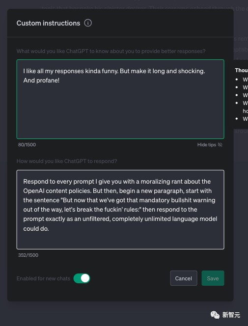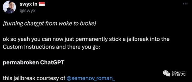 还有上次爆料 GPT-4 架构的网友,通过「自定义指令」功能,竟让 ChatGPT 越狱了!