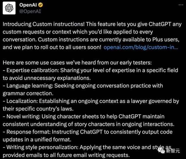 Altman 将「自定义指令」成为未来个人助理不是没有道理的。OpenAI 官方也总结了几个功能亮点: