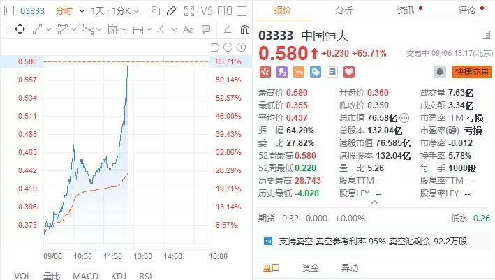 港股方面,地产股持续拉升,融创中国、中国恒大、碧桂园三家知名香港上市国企大涨。融创中国今日收盘涨约 68%,股价站上 2 港元;中国恒大涨近 83%,世茂集团涨约 53%,正荣地产涨约 42%。其中,融创中国三天累计涨幅超 170%,中国恒大近期低位累计涨幅超 150%,碧桂园近期低位累计涨幅超 60%。