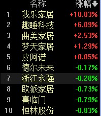 我乐家居继续高开高走封板,盘中已录得 8 个涨停板,趣睡科技涨 6.09%,曲美家居涨 2.53%。