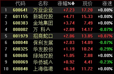 万业企业涨超 7%,新城控股涨 4.71%,金地集团涨 3.74%,保利发展涨 2.03%,华发股份涨 1.19%,京投发展、中国武夷、城投控股、特发服务、新大正等纷纷冲高。
