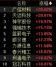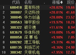 震有科技、天迈科技、华力创通涨停,神宇股份、硕贝德、华体科技等均大幅上涨。