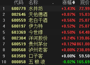水井坊涨 3.43%,天佑德酒、老白干酒、今世缘、贵州茅台均有小幅上涨。
