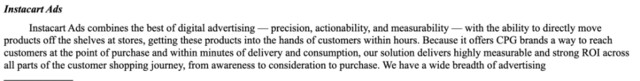 在 Instacart 的招股书中,最引起关注的是提到 “广告” 一词的次数多达 249 次,超过了 “快递”、“取货” 等词语,可见其重要程度。
