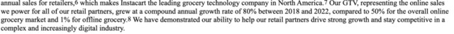 疫情期间市场规模的不断扩张,拉动了 Instacart 的业绩大幅增长。招股书显示,在 2018 年至 2022 年期间,Instacart 总交易额(GTV)复合年增长率为 80%。相比之下整个市场的复合年增长率为 50%。