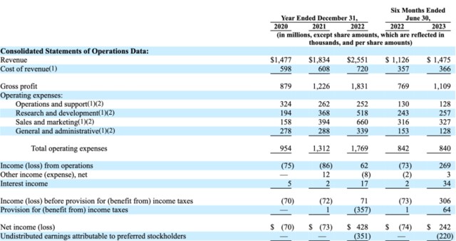 招股书显示,2020 年至 2022 年,Instacart 整体营收分别为 14.77 亿美元、18.34 亿美元、25.51 亿美元,净利分别为-7000 万美元、-7300 万美元、4.28 亿美元,2022 年实现了扭亏为盈。