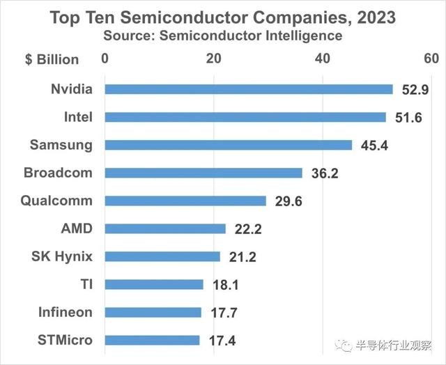 Semiconductor Intelligence 表示,Nvidia 今年可能成为收入第一的半导体公司,该公司预计 Nvidia 2023 年的收入约为 529 亿美元,英特尔为 516 亿美元。