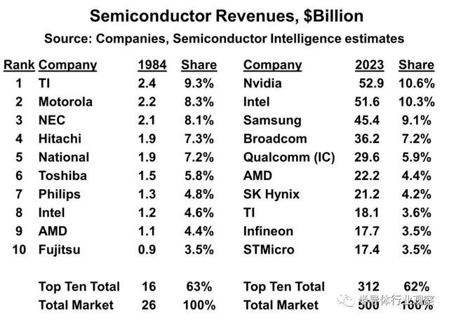 半导体行业的相对稳定性可以从 1984 年和 2023 年十大公司的市场份额看出。1984 年 TI 的份额为 9.3%。到 2023 年,英伟达将拥有约 10.6% 的份额。1984 年前十名公司的市场份额合计为 63%。2023 年这一比例将达到 62% 左右。尽管顶级公司相对稳定,但该行业已从 1984 年的 260 亿美元增长到 2023 年的 5000 亿美元,几乎增长了 20 倍。