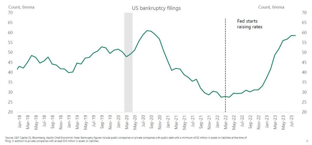 阿波罗全球管理公司(Apollo Global Management)首席经济学家 Torsten Slok 表示,美国每周破产申请的企业数量已接近 2020 年来的最高水平,随着破产申请的增加,违约周期已经开始。